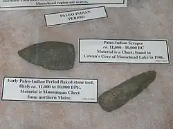 Die ersten menschlichen Bewohner Maines jagten die Großsäuger, doch bis vor wenigen Jahrzehnten waren nur verstreute Funde ihrer Projektilspitzen bekannt, die bei Lebanon im äußersten Südwesten, Lewiston, Monmouth, Arrowsic, Boothbay, Rumford Center, am Graham- am Brassta- und am Flagstaffsee entdeckt worden waren. Erst in den späten 1970er Jahren fand man am Munsungan- und am Chasesee nördlich des Baxter State Parks zwei Werkstätten, Stellen also, an denen bestimmte Steinarten gewonnen und zu rohen Stücken verarbeitet wurden. Dadurch ließ sich der Prozess von der Gewinnung des Steins bis zur Herstellung von Speerspitzen, ebenso wie von Kratzern und Schabern rekonstruieren. Weitere Fundstätten am Magalloway River im Nordwesten von Maine gestatteten Schlüsse auf das Leben in den Lagern der Jäger, Fischer und Sammler. Die größte dieser Fundstätten ist die Vail site, die heute vom Wasser des Aziscohos Lake bedeckt ist. Um 9000 v. Chr. lag sie jedoch am Ostufer des Magalloway. An acht Stellen ließen sich Fundverdichtungen (loci) nachweisen, die Zelte der Bewohner maßen 4,5 mal 6 m und wurden von einer vertieft angelegten Feuerstelle erwärmt. Wahrscheinlich bestanden die loci nicht zur gleichen Zeit, sondern wurden saisonal in verschiedenen Jahren genutzt. Insgesamt fand man mehr als 4000 Werkzeuge, wobei die Projektilspitzen große Ähnlichkeiten zu denen der Debert site im kanadischen Neuschottland aufweisen. Auch wenn etwa 25 km nördlich der Stätte, im Quellgebiet des Magalloway, Stein gewonnen wurde, so stammten viele Sorten doch von den Champlain Lowlands im westlichen Vermont oder vom Munsungan-See, ja, sogar aus New York und Pennsylvania.