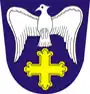 Das Wappen zeigt auf blauen Grund über einem goldenen Kleeblattkreuz eine silberne Taube mit ausgebreiteten Flügeln.