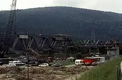 Die Fachwerkmontage der Seitenfelder Brücke erfolgte durch abschnittsweisen Zusammenbau mit Hilfsunterstützungen. Bei dem Hauptfeld wurden zuerst 32 m lange Kragarme im Freivorbau montiert. Anschließend wurde das 144 m lange und 1600 t schwere Mittelstück eingeschwommen und eingehoben. Die Ortbetonplatte wurde mit einem Schalwagen nachträglich ergänzt.