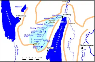 ![]() Einzugsgebiet des Maisinger Bachs mit den örtlichen Bachnamen. Die wichtigsten Moränenzüge sind braun dargestellt. | ||