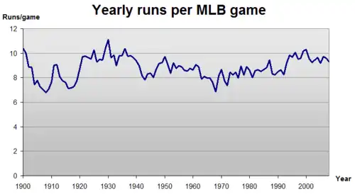 Die Phase von 1900 bis 1919 wird weithin als Dead-Ball-Ära bezeichnet. Die Bezeichnung bezieht sich darauf, dass Spiele in diesem Zeitraum in der Regel niedrige Spielstände aufwiesen und von Pitchern wie Walter Johnson, Cy Young, Christy Mathewson, Mordecai Brown und Pete Alexander dominiert wurden. Weil die Bälle damals aus amerikanischem Garn, und nicht wie heutzutage aus australischem, hergestellt wurden und noch nicht so straff gewickelt werden konnten, legten sie im Durchschnitt deutlich geringere Flugdistanzen zurück.[18] Da der Preis von drei Dollar pro Baseball zu dieser Zeit als sehr hoch galt und die Eigentümer der Teams deshalb nur sehr widerwillig neue Bälle kauften, wurde häufig mit ihnen gespielt, bis sie völlig ausgefranst waren. Zuschauer wurden dazu angehalten, Foulbälle und Home Runs (die nur sehr selten vorkamen) zurückzuwerfen, damit sie weiter verwendet werden konnten. Häufig wurden die Bälle mit den unterschiedlichsten Substanzen manipuliert, um ihre Flugbahn zu beeinflussen (siehe Spitball).[19] Im Jahr 1921 wurden diese Manipulationen verboten. Ein weiterer Grund für die geringe Anzahl an Home Runs war die enorme Größe der damaligen Ballparks. Deshalb wurden hauptsächlich sogenannte „small-ball“-Taktiken wie Singles, Base Stealing, Bunts und die Hit-and-Run-Taktik angewandt.[20] Auch Schlagmethoden wie der sogenannte „Baltimore Chop“, bei dem der Ball mit Absicht hart auf den Boden geschlagen wurde, sodass er möglichst hoch in die Luft flog und der Batter währenddessen die erste Base erreichen konnte, kamen zum Einsatz.[21][22]