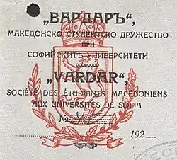 Die Makedonische Studentenvereinigung „Vardar“ (bulgarisch Македонско студентско дружество „Вардар“ Makedonsko studentsko druschestwo „Wardar“) ist eine im Jahr 1920 gegründete Organisation der Studenten der Universität Sofia im damaligen Königreich Bulgarien. Bei den Studenten handelte es sich hauptsächlich um bulgarische Flüchtlinge aus der Region Makedonien. Sie wurde als Nachfolgeorganisation der Makedonischen Studentenvereinigung Goze Deltschew gegründet und unterhielt enge Verbindungen zur Inneren Makedonischen Revolutionären Organisation (IMRO), bis beide nach dem Putsch von 1934 verboten wurden.[1] Der Name der Studentenvereinigung leitet sich vom Fluss Vardar ab, der durch Makedonien in die Ägäis fließt.[2]
