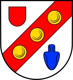 Blasonierung: „In silbernem Schild ein roter, mit 3 goldenen Kugeln belegter Schräglinksbalken, oben ein rotes Schildchen, unten eine blaue Pflugschar.“[20] |