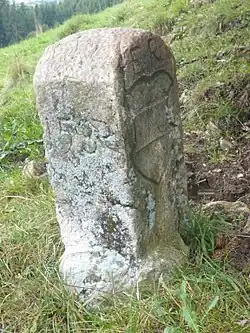 Der Stein weist dadurch eine Besonderheit auf, dass das Wappenschild am Rand barockisierend eingedrückt ist. Er dürfte also einmal erneuert worden sein. - Stein Nr. 9: über den gratt hinauf bey ainer zwifachen weissen Tannen