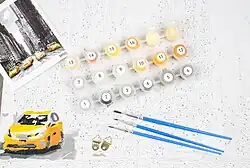 Malen nach Zahlen ist meistens als Komplettpackung (Set) erhältlich, in dem ein Pinsel, „Acrylfarben“ auf Wasserbasis (Malen ohne Geruchsbelästigung) oder auch Öl-Farben sowie ein leinenstrukturierter Malkarton mit dem aufgedruckten Motiv zum Ausmalen und eine detaillierte Anleitung enthalten sind. Es gibt auch Sets, bei denen die einzelnen Flächen nicht nur mit Zahlen, sondern auch mit Buchstaben versehen sind. Die Zahlen finden die Käufer auf den Farbtöpfchen wieder. Die Flächen mit Buchstaben werden eins zu eins gemischt, zum Beispiel aus den Farben 1 + 10 = A jeweils die gleiche Menge. In diesen Sets befindet sich auch ein Kontrollblatt mit den anzumischenden Farbkombinationen.