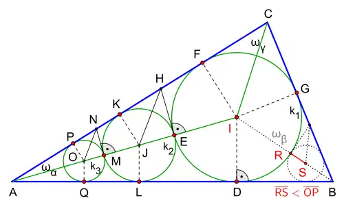 Für die kleineren Kreise zieht man (im gleichseitigen Dreieck) zwei Parallelen zur Strecke – eine ab dem Punkt bis auf die Strecke mit dem Schnittpunkt , die zweite ab dem Punkt bis auf die Strecke mit dem Schnittpunkt Das Errichten des Lots mit dem Fußpunkt auf die Winkelhalbierende und das Errichten des Lots auf die Winkelhalbierende mit dem Fußpunkt ergibt die Mittelpunkte und Nun wird ein Kreis um mit dem Radius und ein Kreis um mit dem Radius gezogen. Um die beiden letzten Berührungspunkte zu erhalten, werden abschließend zwei Lote auf gefällt, von und von , dabei ergeben sich die Fußpunkte und