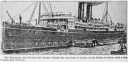 Am Sonntagmorgen, dem 27. Februar, erreichte die Maloja den Hafen von Dover. Während das Schiff dort vor Anker lag, ließ Kapitän Irving eine Rettungsübung an den Boots- und Feuerstationen durchführen und instruierte die Passagiere, wo sie sich im Notfall einzufinden hatten. Um 10.15 Uhr legte der Dampfer in Dover ab und dampfte mit voller Geschwindigkeit in den Ärmelkanal. Die Maloja kam nicht weit. Um 10.30 Uhr lief das Schiff zwei Meilen vor Dover auf eine Mine, die das deutsche U-Boot UC 6 unter dem Kommando von Kapitänleutnant Matthias Graf von Schmettow einige Tage zuvor gelegt hatte. Die Mine traf das Schiff am Heck, eine Säule aus Wasser und Trümmern wurde in die Luft geschleudert und prallte auf das Deck.
