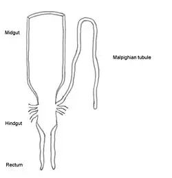 Der Darm und die Malpighischen Gefäße sind durch eine peritrophische Membran getrennt.[1] Epithelzellen transportieren aktiv Kalium- und Natrium-Ionen aus der Hämolymphe der Leibeshöhle in die Malpighischen Gefäße. An den Kalium-Transport ist ein Wasserimport gekoppelt. Aufgrund des aufgebauten elektrochemischen Gradienten kann Harnsäure trotz Konzentrationsunterschied in die Gefäße transportiert werden. Da Harnsäure schwer wasserlöslich ist, liegt sie in den Gefäßen kristallin vor, was für eine Wasserersparnis sorgt. Passiv werden auch Aminosäuren, Zucker, Harnstoff und weitere Salzionen abgegeben. Der pH-Wert liegt in den Malpighischen Gefäßen bei etwa 6,8 bis 7,5. Aus dem gebildeten isoosmotischen Harn werden im Enddarm und im Rectum aktiv Salzionen in die Hämolymphe der Leibeshöhle gepumpt, wobei Wasser wieder passiv nachströmt. Der pH-Wert liegt im Rectum bei 3,5 bis 4,5. Stoffe wie Aminosäuren und Zucker werden hier und im Enddarm wiedergewonnen. Der innergastrale Wasserkreislauf trägt in großem Maße zum Erfolg der Insekten als Landlebewesen bei, da er es ermöglicht einen Großteil an Wasser einzusparen. Die Regulation des Wasser- und Ionenhaushaltes (Osmoregulation) wird über das beschriebene System durchgeführt.[2]