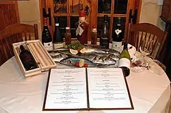 - Lampuki-Auflauf: Ein mit Filet von der Goldmakrele zubereiteter Auflauf mit Spinat, Blumenkohl, Kastanien und Rosinen.