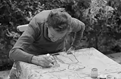In der anthroposophischen Maltherapie[3] stehen der Prozess des Malens und die Wirkung der Farben im Vordergrund. Die ersten Impulse für eine anthroposophische Maltherapie gingen seit den 1930er Jahren von Liane Collot d’Herbois aus, die mit Margarethe Hauschka in einer anthroposophischen Klinik in Arlesheim die künstlerischen Therapien auf anthroposophischer Grundlage entwickelte. Sie betrachtete Farben als Wesenheiten, die zwischen den Polen von Licht und Finsternis entstehen und an der leiblichen und seelischen Konstitution des Menschen mitwirken.[4] In der anthroposophischen Maltherapie wird vorwiegend mit Aquarell- oder Pflanzenfarben gemalt, durch die „der Malende wie bei keiner anderen Maltechnik eintauchen kann in den Malvorgang“ und die Wirkung der verschiedenen Farben erleben kann.[5] Sie bezieht sich dabei auf die Farbenlehre von Goethe,[6] der die Entstehung der Farben aus der Polarität von Licht (Gelb) und Finsternis (Blau) als „Urphänomen“ ableitet. Hier haben nach seiner Auffassung die psychologischen Wirkungen der Farben ihre Grundlage, die er als „sinnlich-sittliche Wirkung der Farben“ bezeichnet. Auf die Farbenlehre Goethes und die sich darauf beziehende anthroposophische Theoriebildung Rudolf Steiners[7] geht die von Rose Maria Pütz entwickelte Methode der „Farbmeditation“ zurück. Dabei gibt sich der Gestaltende der Wirkung einer Farbe hin, indem er sie in transparenten Lagen übereinander schichtet und langsam entstehen lässt.[8]