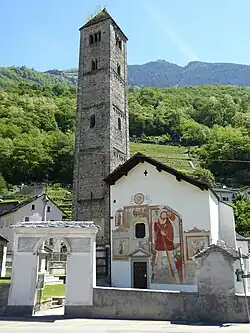 - Die Pfarrkirche San Martino di Tours von 1602–1603,[23][24] mit einem 37,5 m hohen romanischen Glockenturm, umfasst folgende weitere Bauten: – Säule Colonna di San Carlo von 1734; – Beinhaus Ossario; – Kapelle Oratorio Santi Enrico e Apollinare; – Kreuzwegkapellen Via Crucis von 1761[23]