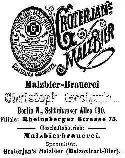 - ↑ Inserate > Groterjans Malzbierbrauerei. In: Adreßbuch für Berlin und seine Vororte, 1902, Teil V, S. 65.