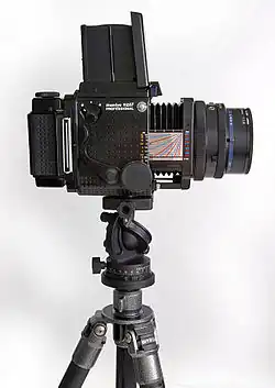 Das Wechselmagazin für die Aufnahme der Filme lässt sich um 90° drehen – damit ist ein Wechsel von Hoch- auf Querformat möglich, obwohl die Kamera auf einem Stativ steht. Das Mattscheibenbild passt sich der Position des Rückteils durch das Einschwenken von Masken in den Sucher an. Ein Wechsel des Magazins während einer Aufnahmesession ist problemlos durch die Trennung mittels Magazinschieber von der Kamera möglich. Dadurch ist das kombinierte Verwenden von Schwarzweiß-, Diapositiv- und Farbnegativfilm innerhalb einer Aufnahmesituation möglich.