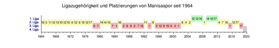 Manisaspor ist ein türkischer Fußballverein aus Manisa. Der Verein spielte in den 2000er und 2010er Jahren insgesamt sechs Spielzeiten in der Süper Lig und befindet sich in deren Ewigen Tabelle auf dem 43. Platz.[1] Seine bisher beste Zeit erlebte der Verein nach der Übernahme im Jahr 2000 des Elektronikkonzerns Vestel. Fortan nannte sich der Verein offiziell Vestel Manisaspor. Mit fünf Drittligameisterschaften ist der Verein gemeinsam mit Elazığspor Rekordmeister der TFF 2. Lig, der dritthöchsten Spielklasse im türkischen Profifußball.