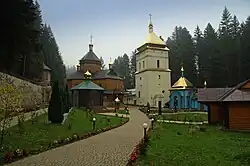 Oberhalb des Dorfes liegt im Wald ein bekanntes Kloster (⊙) der ukrainisch-orthodoxen Kirche (Kiewer Patriarchat) aus dem 17./18. Jahrhundert.[Anmerkung 2]