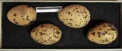 Das Gelege besteht meist aus drei, seltener auch aus zwei Eiern; größere Gelege stammen von mehreren Vögeln. Die Eiablage erfolgt über fünf bis sechs Tage. Die Eier sind mit etwa 77 × 53 mm wesentlich größer und heller als die von Silber- und Heringsmöwe. Sie sind auf hellgrauem, beigen, bräunlichem oder hell olivfarbenem Grund unregelmäßig und grob gesprenkelt, glatt und relativ glanzlos. Die Bebrütung beginnt mit dem ersten oder zweiten Ei und dauert 26 bis 28 Tage. Beide Partner brüten.[24][25]