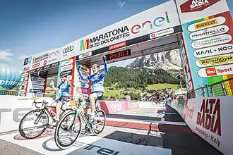 - ↑ Auskünfte der Pressestelle des Komitees "Maratona dles Dolomites" Str. Damez 34 I-39036 Badia (Bozen)