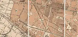 - Rüdersdorfer Straße (nach West) und Torellstraße (nach Ost) sind der leicht schräg kreuzende Straßenzug[28] am Südrand des Planplatzes B. Die Rüdersdorfer Straße erhielt ihren schrägen Verlauf durch die Lage am alten Bahnhof der Ostbahn (Küstriner Bahnhof, er ist bei Hobrecht noch nicht vorhanden) und knickt erst wenig vor der Marchlewskistraße (an der geplanten Bromberger Straße) mehr nach Ost. Östlich der Marchlewskistraße setzt die Torellstraße am Südrand des Comeniusplatzes den Verkehrszug zur Kopernikusstraße fort.