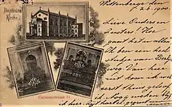 - In dem am 25. Oktober 1931 eingeweihten Gebäude[79] Marchlewskistraße 40 (damals Memeler Straße 53/54) befindet sich die evangelische St. Lazarus-Kirchengemeinde.[80] („Lazarushaus“)[81] Als die St. Markus-Kirche in Friedrichshain (Lazaruskirche in der Romintener Straße, 1936: → Grünberger Straße) im November 1943 durch Bombentreffer beschädigt wurde[82][27] und 1944 das Kirchenschiff bereits offen war, zog die Markus-Gemeinde ebenfalls zum Lazarushaus um. Die Ruine am Standort Grüneberger / Kadiner Straße wurde 1949 abgetragen. Die Lazarusgemeinde war 1892 aus der großen Markusgemeinde hervorgegangen. Das Grundstück der Lazarusgemeinde war vor der Errichtung des Gemeindebaus als Doppelgrundstück 53/54 mit 4700 m² Fläche genannt. Davon war der nördlichere Teil Memeler Straße 53 mit einem Wohnhaus an der Straße bebaut sowie mehreren Gebäuden in der Blocktiefe. Das Grundstück ging 1926 vom Fournierholzhändler Pietsch[83] an die Stadtsynode (Lazarusgemeinde).[84] Das Gemeindehaus wurde in der Mitte der schräg zur Straße liegenden Grundstücksfläche errichtet, es wurde im Krieg beschädigt. Spätestens seit den 1950er Jahren und der neuen Nummerierung wurde das Grundstück als getrennt dargestellt: der Eingang zum Bau mit dem Kirchensaal erfolgt über Marchlewskistraße 40 eine dreieckige Fläche 36 am Norden mit 750 m² gehört allerdings ebenfalls der Lazarusgemeinde. Das kriegsbeschädigte Vorkriegs-Wohnhaus wurde schwer getroffen und es wurden bauliche Veränderungen durchgeführt. Hinter der Grundstücksmauer mit ungefähr 20 m Straßenlänge steht ein eingeschossiges (Rest-)Gebäude an der Nordostecke.