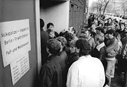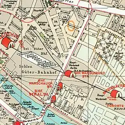 - ↑ Straßenbahngeschichte: Das Straßenbahnnetz war bereits am 15. Januar 1953 gespalten worden. So endeten die Linien 3 und 4 der BVG-Ost Warschauer Straße/Mühlenstraße. Mit dem Mauerbau gab es an der Oberbaumbrücke keine durchgehende Linienverbindungen mehr. Am 13. August 1961 wurde die Oberbaumbrücke für den gesamten Verkehr einschließlich der U-Bahn gesperrt.