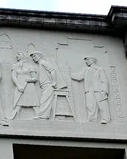 Unter der früheren Hausnummer 39 (→ Marchlewskistraße 6) steht die 1884 eröffnete ehemalige Feuerwache Friedrichshain Wache Memel.[53] Der Gebäudekomplex wurde nach Plänen von Hermann Blankenstein für die Berufsfeuerwehr Friedrichshain errichtet. Es war ein dreigeschossiger Bau mit roten Verblendklinkern und Terrakottareliefs. Für die Ausfahrten der Feuerwehr waren vier Tore im Stil der Neorenaissance vorhanden. Nach dem Zweiten Weltkrieg war nur noch das Erdgeschoss erhalten. Das Haus erhielt 1946 ein Notdach[54] und wurde bis 1956 weiter für die Feuerwehr genutzt. Die darauf in das neue Gebäude umzog.