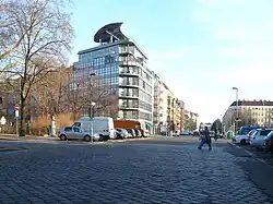 | Marchlewskistraße in Höhe Comeniusplatz, das Gebäude mit dem auffälligen Dach heißt Comenius-Eck | |