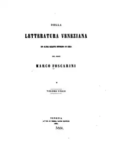 - ↑ Zuerst veröffentlicht unter dem Titel Discorso di Marco Foscarini Doge di Venezia per la prima volta pubblicato nelle nozze Zen e Correr, Picotti, Venedig 1819 (Digitalisat).