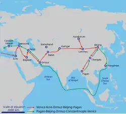 Marco Polos Vater Niccolò und sein Onkel Maffeo brachen 1260 zu einer Reise auf, um am Unterlauf der Wolga Edelsteine zu verkaufen. Über Konstantinopel gingen sie nach Soldaia (heute Sudak) auf der Krim, wo Marco der Ältere, der dritte der Brüder Polo, ein Kontor betrieb. Somit reisten sie nahezu auf derselben Route, die auch Wilhelm von Rubruk 1253 für seine Mission gen Osten gewählt hatte. Bevor die Polos nach Asien zu den Mongolen aufbrachen, hatten schon die Mönche André de Longjumeau und Johannes de Plano Carpini im Auftrag von Papst Innozenz IV. und später auch Wilhelm von Rubruk im Auftrag von König Ludwig IX. jeweils eine solche Reise in offizieller Mission angetreten. Nach ihrer Rückkehr verfassten sie jeweils eigene Reiseberichte.[8] Nach ihrem Zwischenaufenthalt gelangten die Polos in das Gebiet, das damals von der Goldenen Horde beherrscht wurde, und hielten sich etwa ein Jahr in der Nähe des Dschingis-Khan-Enkels Berke Khan an der Wolga auf. Anschließend wurden sie durch die dort noch herrschenden Kriegswirren immer weiter gen Osten über den Fluss Ural und entlang der Seidenstraße (nördlicher Abzweig nach Südrussland) bis nach Buchara verschlagen.