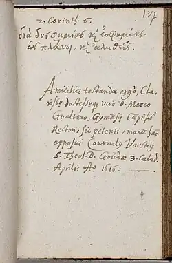 - ↑ Sein Stammbuch befindet sich in der Königlichen Bibliothek der Niederlande unter der Signatur 133 L 8. Angabe nach der Datenbank Repertorium Alborum Amicorum der Universität Erlangen.