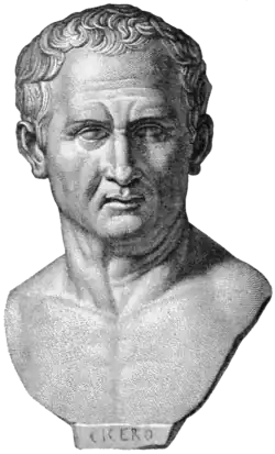 Marcus Tullius Cicero (Aussprache in klassischem Latein etwa [ˈkɪkɛroː], deutsche Aussprache des Lateinischen meist [ˈt͡sɪt͡seʁo], Aussprache im Deutschen [ˈt͡siːt͡seʁoː];[1] * 3. Januar 106 v. Chr. in Arpinum; † 7. Dezember 43 v. Chr. bei Formiae) war der berühmteste Redner des alten Rom, zudem Anwalt, Schriftsteller, Philosoph und Politiker, der als Homo novus im Jahr 63 v. Chr. das Konsulat bekleidete. Als oberster Magistrat der Römischen Republik rettete er diese ein letztes Mal, indem er die Verschwörung des Catilina niederschlug. Der Senat ehrte ihn dafür mit dem Titel pater patriae (Vater des Vaterlandes).