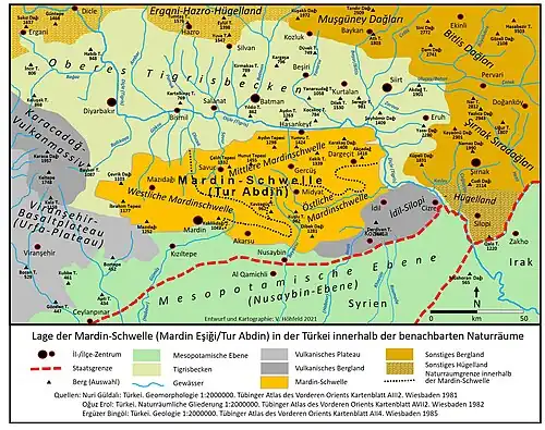 - ↑ Catherine Kuzucuoğlu, Attila Çiner und Nizamettin Kazancı: Chapter 4. The Geomorphological Regions of Turkey. In: Catherine Kuzucuoğlu, Attila Çiner und Nizamettin Kazancı (Hrsg.). Landscapes and Landforms of Turkey. Springer International Publishing, Cham 2019, ISBN 978-3-030-03513-6 (World Geomorphological Landscapes), S. 41–178, behandelt Südostanatolien ab S. 132, zur Lage der Mardin-Midyat-Schwelle s. Karte a) S, 134