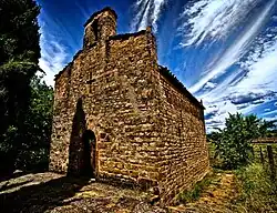 - Das Dach der ehemaligen Pfarrkirche Sant Esteve aus dem 13. Jahrhundert ist bereits seit langem eingestürzt. Der frei danebenstehende Glockenturm (campanar) wurde später hinzugefügt.