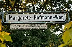 - 2001: Straßenbenennung: Margarete-Hofmann-Weg im Stadtteil Vahrenheide[8]