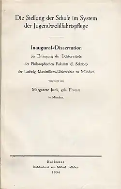 Margarete Fromm, Tochters des Staatsanwalts Justus Wilhelm Louis Julius Fromm und dessen Ehefrau Auguste Friederike Fromm, geborene Reich, besuchte in Essen und Ratibor das Lyzeum. In letztgenannter Stadt legte sie im März 1918 die Reifeprüfung ab. Anschließend absolvierte sie die Wirtschaftliche Frauenschule Rothenburg ob der Tauber. Diese Ausbildungsstätte war im Besitz des Bayerischen Vereins für wirtschaftliche Frauenschule auf dem Lande, die 1916 dem Reifensteiner Verband angeschlossen wurde. Die Frauenschule war im Haus des Grafen Sayn-Wittgenstein im Herrenmarkt untergebracht. Im nahegelegenen Gut Zehlersgut erlernten die Schülerinnen praktisch vor Ort Viehhaltung, Gartenbau, Milchwirtschaft u. dgl. m.[1] Nach der einjähren landwirtschaftlichen Ausbildung bezog Fromm im Sommer 1919 die Universität Göttingen, um Rechts- und Staatswissenschaften zu studieren. Bereits im Wintersemester wechselte sie an die Universität in Frankfurt/Main. Nach fünf Semester brach sie das Studium ab, um zu heiraten. Aus der Verbindung ging ein Sohn hervor. 1931 wurde ihre Ehe geschieden. Fortan lebte Magarete Junk als alleinerziehende Mutter. Unmittelbar nach der Scheidung setzte Junk ihr Studium in München fort.[2] Dieses beendete sie 1933 mit der Promotion. Das Thema ihrer Dissertation, die von Aloys Fischer betreut wurde, lautet: Die Stellung der Schule im System der Jugendwohlfahrtspflege. In ihrer 42 Seiten umfassenden wissenschaftlichen Arbeit begrüßt Junk die neue staatliche Entwicklung: