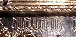 Die Stifterinschrift am Sockel des Reliquiars ist in gotischer Minuskel ausgeführt. Die etwa einen Zentimeter hohe Inschrift ist schwer lesbar. Der Graveur arbeitete wenig sorgfältig, verwendete verschiedene Schreibformen eines Buchstabens nebeneinander und gravierte an einigen Stellen fehlerhaft. Dazu unterliefen ihm Abschreibfehler, unter anderem im Namen Castell, den er Custell schrieb. Aufgrund dessen hatte Georg Humann nur die Worte brachium Sancti Quintini und Margarete von Castell entziffert, was zur Zuschreibung des Reliquiars ausreichte. 2006 gelang es Sonja Hermann, die vollständige Inschrift zu entziffern: beachiu Sancti quintini ornatu per executores Illusteis margarete de custell pptisse ass. Nach Korrektur der Fehler des Graveurs und Auflösung der Abkürzungen ergibt sich brachium Sancti quintini ornatum per executores Illustris margarete de castell prepositisse assiendis zu deutsch Arm des Heiligen Quintin, geschmückt durch die Testamentvollstrecker der vornehmen Margarete von Castell, Pröpstin von Essen. Das Reliquiar wurde also nicht, wie in der älteren Forschung angenommen, von Margarete von Castell selbst, sondern von ihren Testamentsvollstreckern in Auftrag gegeben.