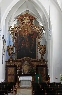 Das Schiff ist 22,04 m lang und 6,97 m breit, der Chor 9,30 m hoch und 4,96 m breit. Der kreuzrippengewölbte Chor zeigt den 5/8 Schluss und ist einjochig und eingezogen. Die Schlusssteine im Gewölbe sind mit Rosen- und Lilienblüten verziert und zeigen die Buchstaben M R S. Der barocke Altar stammt ursprünglich aus der zum Stift Garsten gehörigen Kirche Maria Magdalena im Haselgraben bei Linz. Von dort gelange er anlässlich einer Erneuerung der Kirche nach Steyr. Das heute noch vorhandene Altarblatt von 1727 zeigt die Vierzehn Nothelfer, Künstler ist der Garstner Hofmaler Karl von Reslfeld.[2] Bei der Restaurierung 1977/78 wurde die Mauer zwischen Langhaus und Chor entfernt. Die barocken Fenster im Chor verblieben.[3]