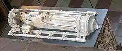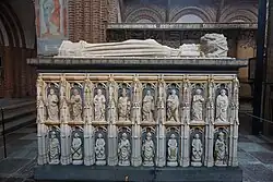Margarethe hatte gewünscht, im Kloster Sorø beigesetzt zu werden; dort hatten auch bereits ihr Vater Waldemar IV. und ihr Sohn Olav ihre letzte Ruhe gefunden. Im Sommer 1413 ordnete aber Bischof Peder Jensen Lodehat von Roskilde die Überführung von Margarethes Leichnam von Sorø in den Dom zu Roskilde an. Wahrscheinlich war sein Motiv dahinter, seiner Metropolitankirche eine größere Bedeutung zu verleihen. Der Roskilder Dom war auch die Begräbnisstätte für die meisten späteren dänischen Herrscher. Im Gegensatz zu den anderen 37 Königen, die hier bestattet wurden und in Nebenräumen ruhen, befindet sich Margarethes aus schwarzem Marmor verfertigter Sarkophag mitten vor dem Altar, gleichsam am prominentesten Platz des Weltkulturerbes. Den Deckel des Sarkophags ziert eine lebensgroße liegende Statue der großen Herrscherin aus Alabaster. Sie hat eine aufwändige Frisur und trägt eine leinene Kopfbedeckung mit einer Krone sowie ein tief ausgeschnittenes Kleid.[41][42] Das originale Grabmal wurde 1423 von dem Lübecker Bildhauer Johannes Junge vollendet (ein verworfenes Bruchstück befindet sich im Lübecker St. Annen-Museum); da jedoch die kleineren Verzierungen beschädigt, im späten 18. Jahrhundert entfernt und erst zwischen 1862 und 1912 ersetzt wurden, ist die Statue das wohl einzige original erhaltene Teil.