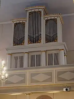 Die Orgel wurde 1828 von dem Orgelbauer Christian Roetzel (Alpe) erbaut. Der klassizistische Orgelprospekt wurde 1827 nach einem Entwurf der Preußischen Oberbaudeputation, nach Angaben von Karl Friedrich Schinkel, gebaut. Das Instrument stand ursprünglich auf einer 2. Empore, oberhalb der heutigen Orgelempore, die allerdings 1940 abgerissen wurde.[1] Das Instrument hat 20 Register auf zwei Manualen und Pedal. Die Hauptwerksregister stehen auf Schleifladen, Unterwerk- und Pedalregister stehen auf Bohlenladen.[2]