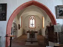Älteste Teile der romanischen Kapelle aus dem 13. Jahrhundert sind erhalten. Der niedrige Chor mit seinem zweijochigen Kreuzgratgewölbe und die an der Südseite des Chors angebaute Sakristei erhielten in der ersten Hälfte des 14. Jahrhunderts ihre heutige Gestalt, worauf die Maßwerkfenster hinweisen.[13] Zwischen Sakristei und Chor gewährt ein Spitzbogen mit Schlussstein den Durchgang. Ein kleines romanisches Fenster mit Gewänden links über der Tür zur Sakristei wurde in den 1960er Jahren freigelegt und anschließend wieder vermauert. Links der Sakristeitür dient eine große rundbogige Nische als Sitzgelegenheit. An der gegenüberliegenden Nordwand befindet sich ebenfalls eine große Rundbogennische. Über der rechteckigen Sakristei-Außentür an der Südseite ist noch ein kleines rundbogiges Fenster aus romanischer Zeit erhalten. Ein großer spitzbogiger Triumphbogen verbindet den Chor mit dem asymmetrisch angebauten Kirchenschiff. Die rot umlaufenden Bänder am Bogen und an den Fensterlaibungen wurden 2003 gemalt.