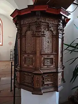 Das Gestühl datiert von 1516. Nord- und Westempore stammen aus dem Jahr 1547 und die Südempore wurde im 18. Jahrhundert eingebaut. Die Brüstungen gehen auf das 18. Jahrhundert zurück, die Balustraden der Emporenbänke auf die erste Hälfte des 17. Jahrhunderts.[1] Die polygonale hölzerne Kanzel, ein Werk der ausgehenden Renaissance (um 1640), ist mit Intarsien und geschnitztem Beschlagwerk reich verziert. Eckpilaster gliedern die Kanzelfelder, die durch umlaufende, profilierte Gesimsbänder verbunden sind.