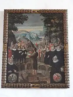 Zwei gemalte Epitaphe, die im Jahr 1879 an Freiherr Adrian van der Hoop auf dem Hofgut Schmitte in Rodheim-Bieber verkauft und von dort 2009 zurückerworben wurden, flankieren seit 2010, nach 1880 erneut restauriert, den Triumphbogen. Das linke ist für Barthel Kolb († 1621), nassau-weilburgischer Rentmeister zu Gleiberg, und seine Ehefrau Anna Elisabeth Braun genannt Hell († 1634) mit ihren Kindern;[19][20] das rechte Epitaph ist für Hans Gottfried Stommel († 1579), nassau-weilburgischer Burgmann zu Gleiberg, und seine Ehefrau Maria Wolfskehl von Vogtsberg[21] († 1570) mit ihren Kindern.[22][23][24]