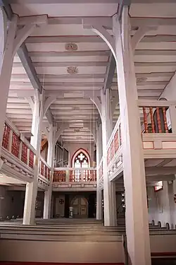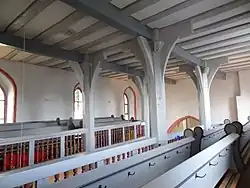Der Innenraum wird von einer hölzernen Flachdecke abgeschlossen. Zwischen den Deckenbalken sind barocke musizierende Engel gemalt. Eine Besonderheit ist die Holzpfeilerkonstruktion aus gotischer Zeit. Sie gilt als das „bedeutendste erhaltene Beispiel einer spätgotischen Holzpfeilerkirche in Hessen“.[1] Zwei Unterzüge werden von je drei achteckigen Holzpfeilern mit jeweils vier Kopfstützen getragen, die die Emporen einbeziehen. Durch diese Konstruktion entsteht der Eindruck einer dreischiffigen Hallenkirche.[13] Die dreiseitig umlaufende Empore hat Balustraden mit gedrechselten Holzstäben.