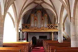 Das Innere der Kirche, das in drei Schiffe unterteilt ist, wird durch ein spätgotisches Netzgewölbe geprägt. Bemerkenswert sind die grotesken Masken die bei einigen Gurtbögen der Gewölbe als Konsolenfiguren dienen. Die Schlusssteine der Gewölbe beherbergen symbolische Motive. So finden sich darunter der Bundschuh und eine sich nach einem Ring ausstreckende Hand, dessen Symbolgehalt ungeklärt ist. Letzteres Motiv findet sich auch an der Außenwand des Chores.[4]
