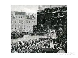 Ankunft des Trauerzugs von Marguerite Boucicaut vor der Kirche St-Thomas d’Aquin, Paris, Lithographie von Paul Destez (1887)