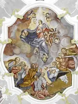 Die reiche Stuckdekoration (Akanthus, Rosensträuße in Vasen, Blütenketten und Muschelwerk) schuf um 1750 Matthias Abel aus Neuburg an der Donau († um 1754). Die gleichzeitig entstandenen Fresken an der Decke und den Wänden stellen Szenen aus dem Marienleben dar, das Hauptfresko die Himmelfahrt Mariens. Ergänzend sind Darstellungen aus dem Alten Testament und aus der Lauretanischen Litanei zu sehen, zum Teil in Grisaillen-Szenen. Über den stuckierten Kartuschen für die Fresken sind stuckierte Engelsköpfe zu sehen. Die Tondi über den stuckierten Apostelkreuzen zeigen in Flachreliefs die 12 Apostel-Köpfe. Das Fresko innen über dem Eingang zeigt die Stärkung der Armen Seelen im Fegfeuer durch Engel, darüber auf Wolken die Heilige Familie.[5]