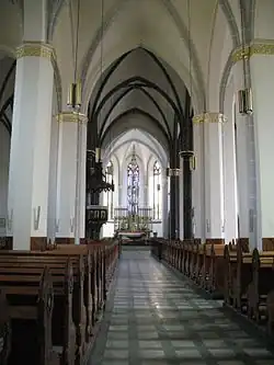 Drei frühgotische Steinportale vom Ende des 13. Jahrhunderts erschließen die Kirche im Westen. Der Staffelgiebel mit Blendengliederung und Fialen stammt von der Restaurierung in den Jahren 1903–1907. Die Satteldächer und das Strebewerk wurden teilweise in den Jahren 1903–1907 umgestaltet. Das frühgotische dreischiffige Langhaus auf quadratischem Grundriss (in der Art eines Westfälischen Quadrats) ist mit einer Vorhalle am Eingang versehen und wird von Spitzbogenarkaden auf Pfeilern gegliedert, davon sind die östlichen Halbpfeiler des ehemaligen Triumphbogens auf vierblättrigem Grundriss gestaltet und von Diensten umstellt. Der Chor ist einschiffig und endet in einem polygonalen Dreiachtelschluss.