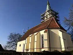 Die unteren Geschosse des Kirchturms und der eingezogene, dreiseitig geschlossene Chor wurden Ende des 15. Jahrhunderts erbaut. Sie werden beide von Strebepfeilern gestützt. Das Langhaus wurde 1762 nach Westen an den Chor angebaut. Der Turm erhielt 1858 ein mit einem spitzen Helm bedecktes Obergeschoss für den Glockenstuhl und die Turmuhr.