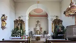 Den Innenraum prägen ein Hochaltar und zwei Seitenaltäre. Der Hochaltar besteht aus einem Steinstipes auf dem ein klassizistischer Drehtabernakel mit zwei Schwebeengeln, ein Werk wohl um 1780 entstanden, steht. An der Ostwand hängt darüber ein frühklassizistisches Altarkreuz, umgeben von Statuen von Maria und Johannes sowie darunter von zwei großen Engeln. Den südlichen Seitenaltar, den Marienaltar, schmückt eine Statue mit der trauernden Maria mit dem Leichnam Jesu unter einem hölzernen Säulenbaldachin, um 1520/1530 entstanden. Auf dem nördlichen Seitenaltar, dem Kreuzaltar, befindet sich eine Statue die unbefleckte Empfängnis der Muttergottes Maria zeigend. Beide Seitenaltäre bekrönen Medaillons.[3]