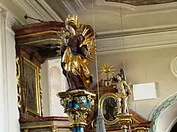 Der fürstbischöfliche Hofmaler Johann Michael Franz schuf die Deckengemälde im Langhaus im Jahr 1778. Sie stellen die Aufnahme Mariens in den Himmel und die Begrüßung Mariens durch die heilige Elisabeth dar.