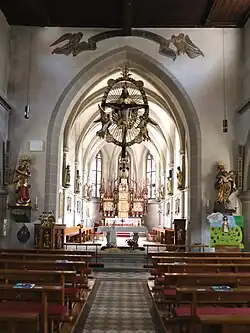 Markant ist im Innenraum der am Chorbogen aufgehängte Gnadenstuhl, eine Schnitzarbeit des Tiroler Künstlers Franz Schmalzl aus den 1920er Jahren. Er stellt die Trinität in Verbindung mit dem Leiden Christi dar.[1]